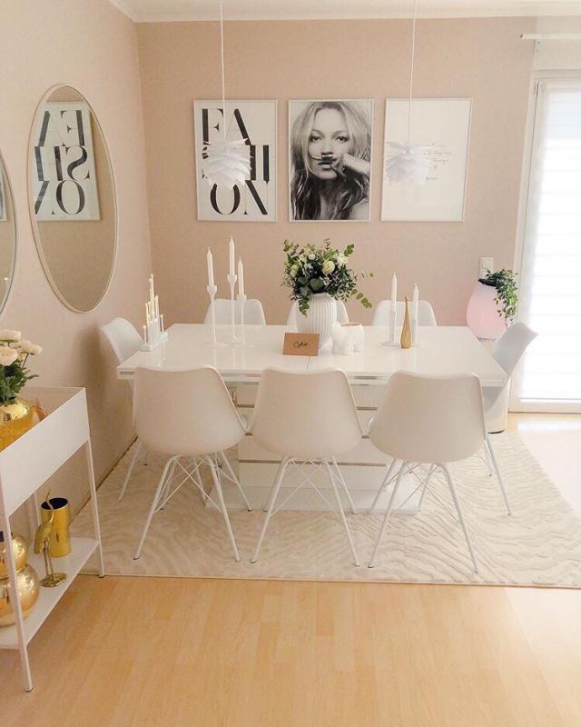 The simple white Nordic table is very fresh and beautiful. The decoration of candles and flowers shows the artistic atmosphere. Pink wall, very girl vitality. The wall is decorated and arranged with frescoes and large round mirrors, which not only add three-dimensional sense, but also super eye-catching, so it's art to take a shot at will.